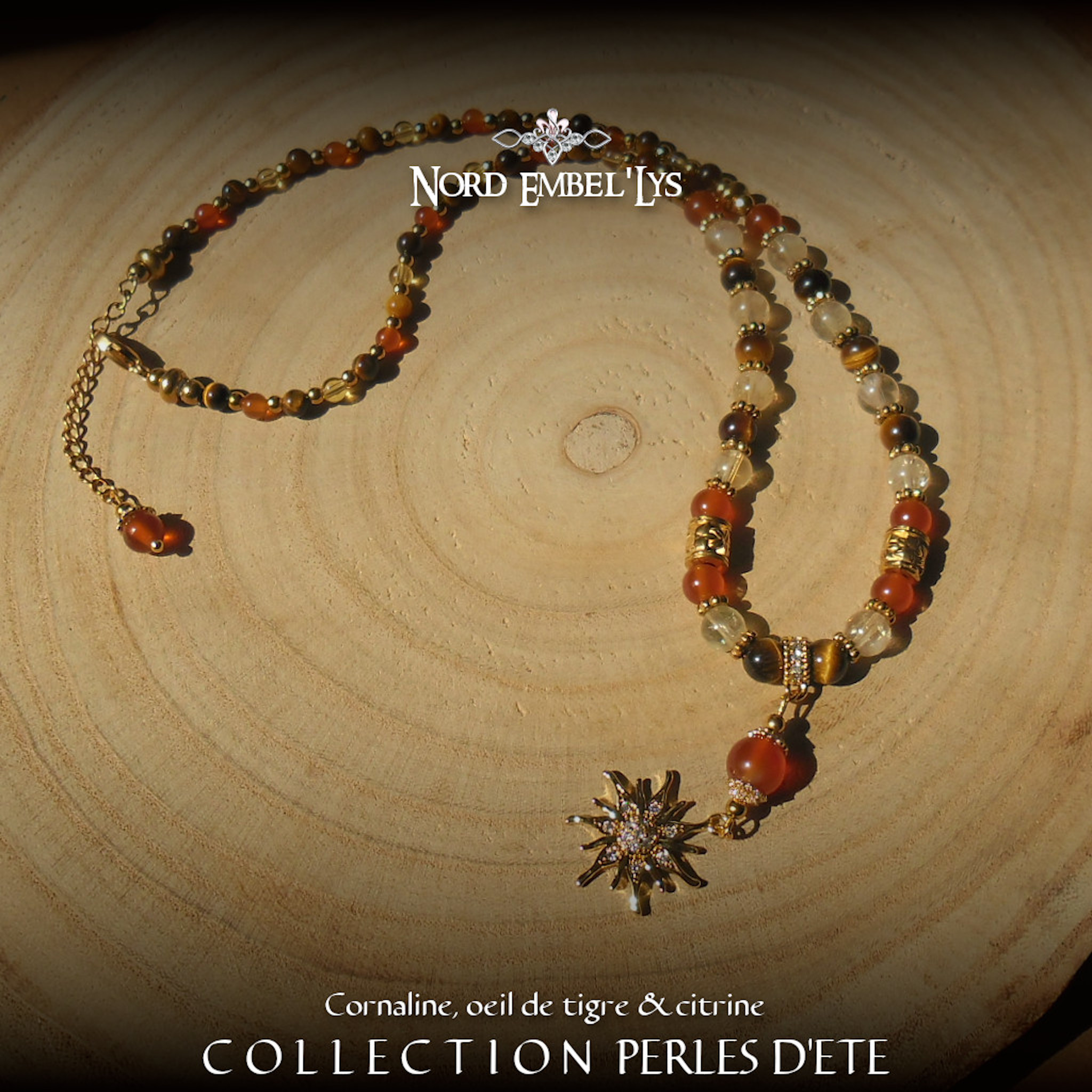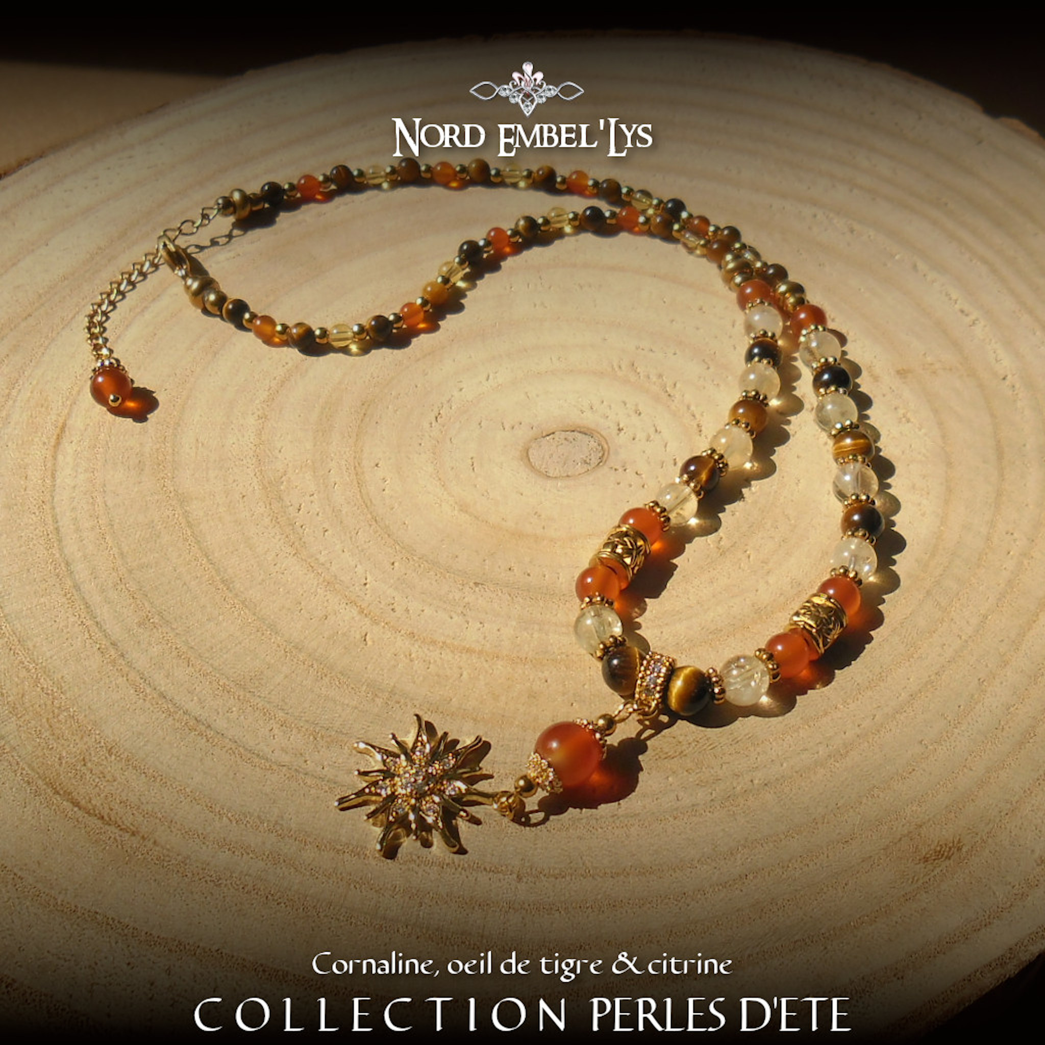 Dans la Collection Perles d’Eté, voici un collier pendentif « Soleil d’Eté » en perles naturelles dont les pièces métalliques sont principalement en acier inoxydable. Ce collier est pourvu d’un joli petit soleil doré incrusté de zircons en guise de breloque avec un subtil assortiment de perles naturelles de cornaline, d’œil de tigre et de citrine de qualité. Toutes ces nuances de couleurs vives fournissent un assortiment idéal à porter l’été. A offrir, ou à s’offrir. 😉